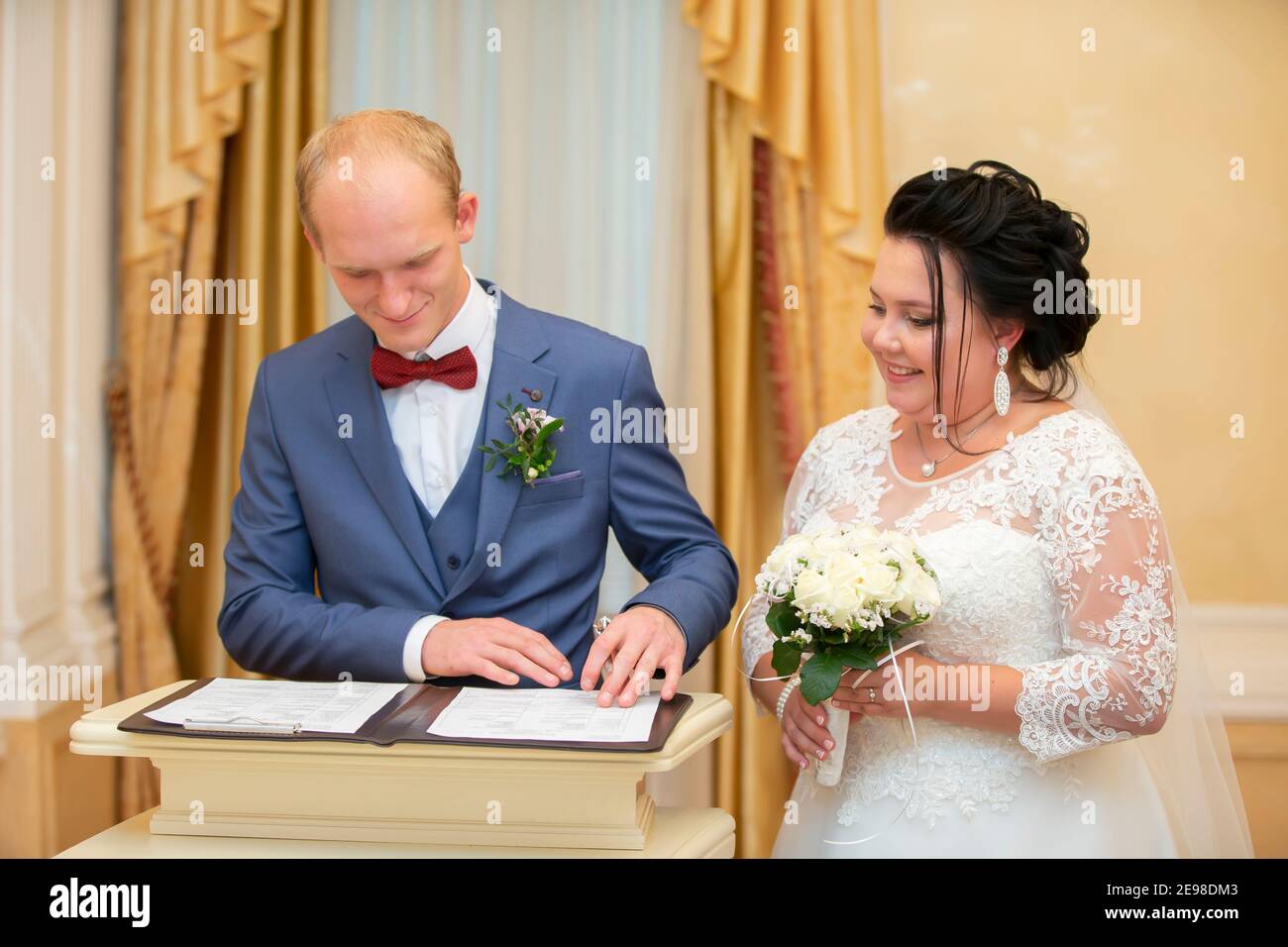 Official Ceremony Of Marriage Registration In The Registry Office In Ukraine Young Beautiful Couple Bride And Groom Put Signatures On Form Smiling Bride Is Holding Pen And Small Wedding Bouquet Stock Photo